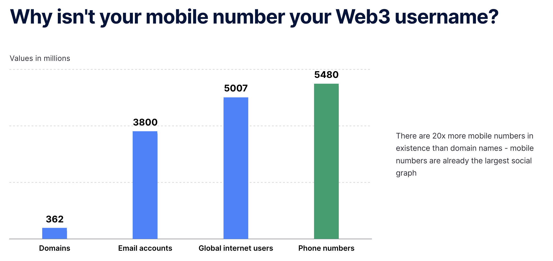 `Most of us have a mobile number but not a domain name`. Why should we be forced to learn a new behavior in Web3, and get a domain name as a wallet identifier? Since we already have mobile numbers, why don’t those become our wallet addresses?